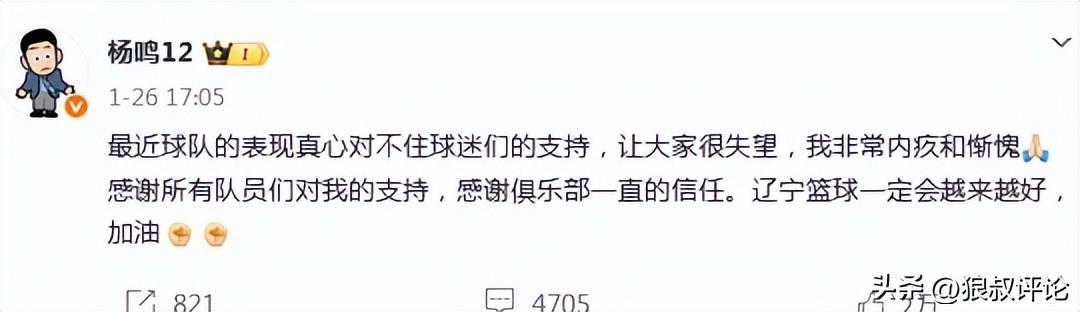 杨鸣当时更新社媒发文表示:最近球队的表现真心对不住球迷们的支持,让大家很失望,我非常内疚和惭愧,感谢所有队员们对我的支持,感谢俱乐部一直的信任。辽宁篮球一定会越来越好。