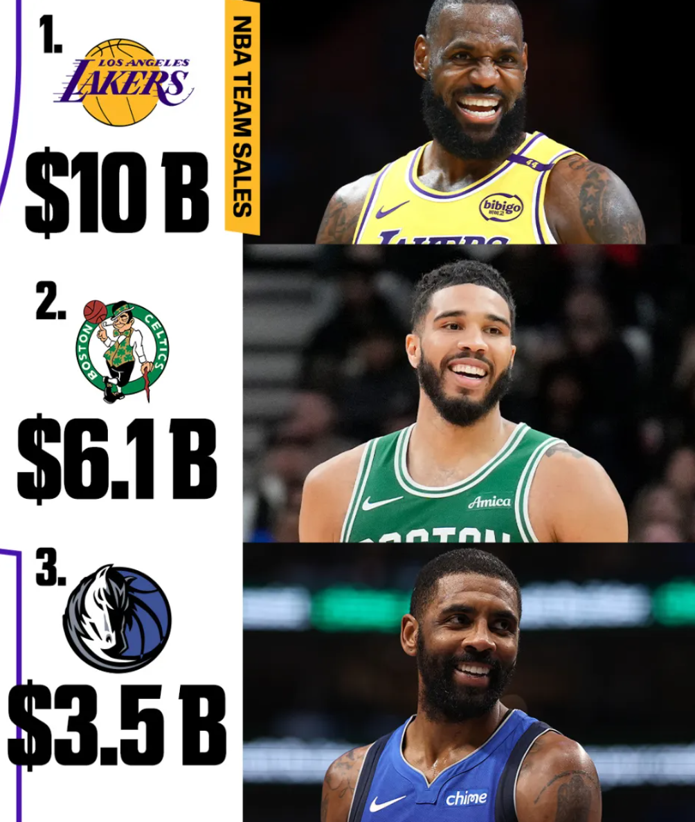 这也是NBA近几年第三次重大的卖队交易,第一次是2023年库班卖掉小牛队大部分股权,卖了35亿美元;第二次是2024年凯尔特人全队被卖了61亿美元;第三次就是2025年湖人队大部分股权被卖了100亿美元。